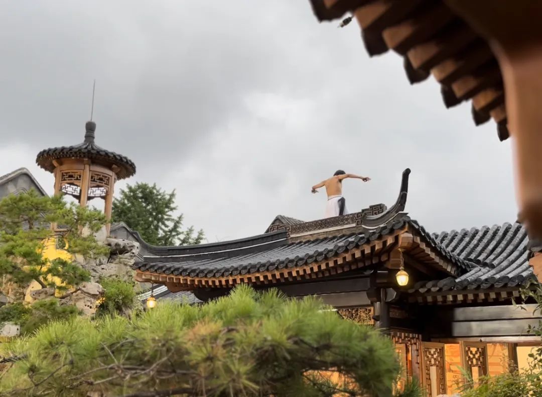 “风沙”部分,舞者在屋顶迎风起舞,给人强烈的视觉震撼。