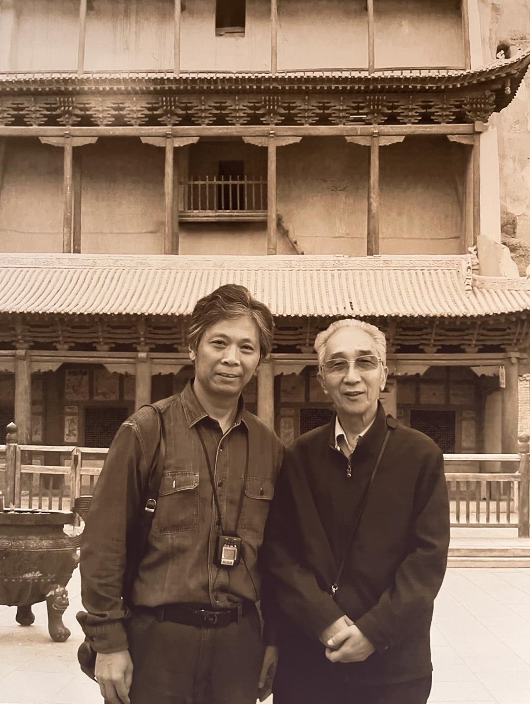 艺术家靳尚谊(右)与唐勇力在敦煌合影宁强讲到,靳尚谊和唐勇力,一个油画家和一个国画家,分别从自己专业创作的角度探索中国当代美术的发展之路,两个艺术家思考和实践路径,有一个共同的交接点-敦煌壁画。