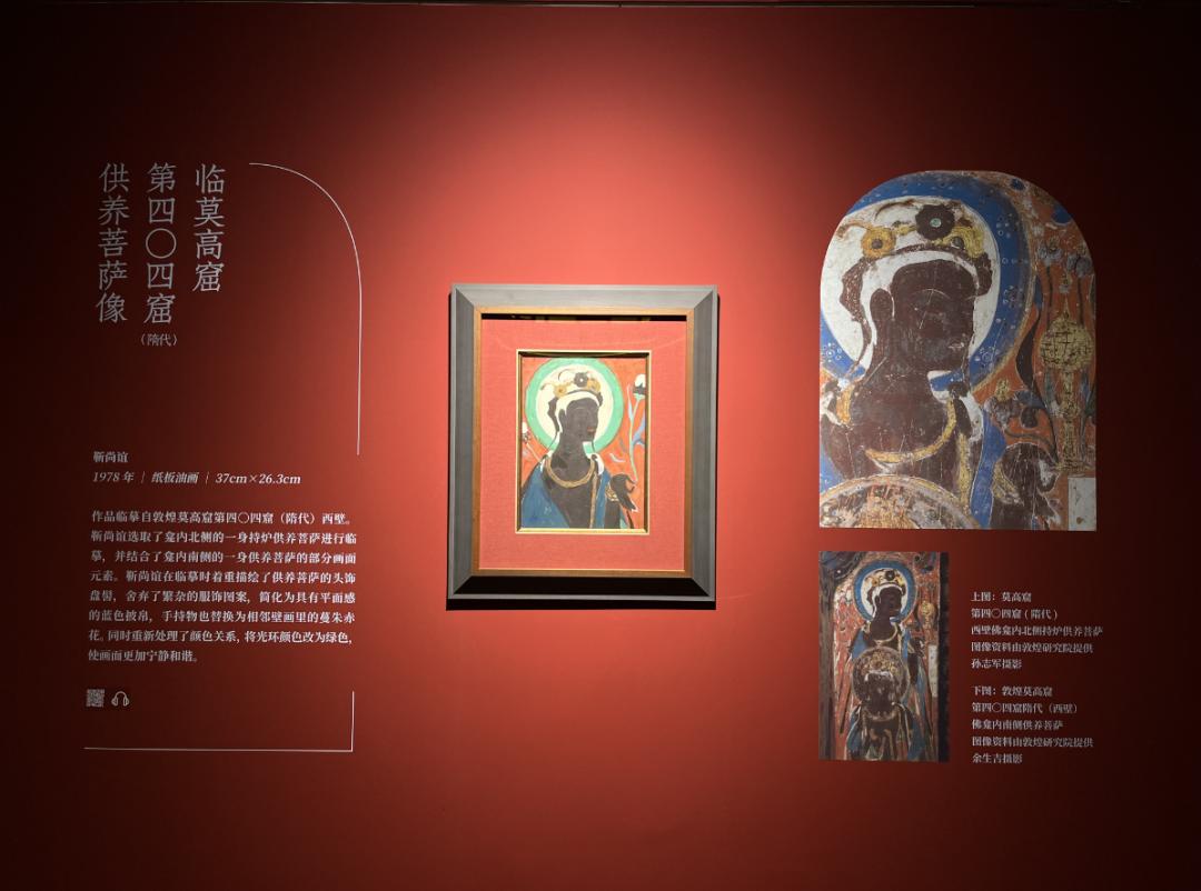 展厅搭建出艺术家进入敦煌石窟内写生的场景,使观众能身临其境地体验艺术家的创作过程。展示了靳尚谊1978年在敦煌写生的6幅作品,北魏时期第254窟南壁上的《萨埵太子舍身饲虎》,隋代第404窟西壁龛内北侧的《供养菩萨》,初唐第57窟南壁的《观音菩萨》和西壁龛内南侧的《供养菩萨》,第220窟北壁大幅《药师经变》图局部里的《供养菩萨》,元代第3窟北壁《千手千眼观音》图里的局部人物《老年男性婆娑仙》。