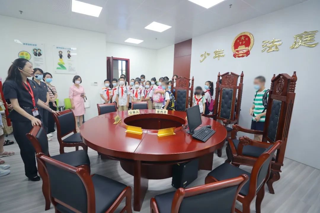 接着,同学们跟随法官们来到少年法庭,参观了法庭内圆桌审判庭、心理咨询室、远程调解室等设施,知道了圆桌法庭是为了减轻未成年人在案件审理中的心理负担,拉近法官与未成年人当事人的心理距离,以利于发挥寓教于审的作用。