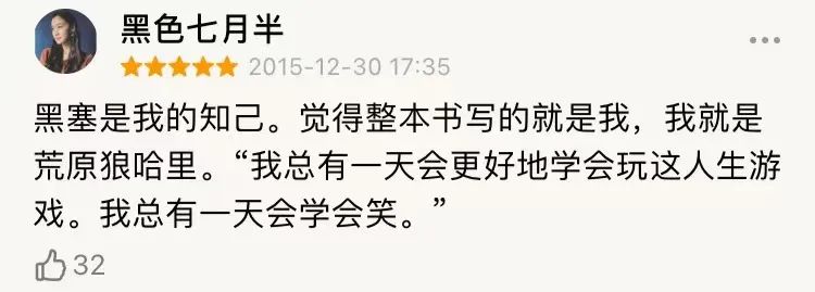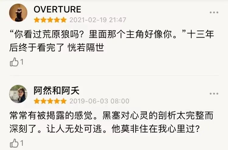 如果你正处于人生的低谷之处,一定要读读《荒原狼》,它能让你瞬间平静下来,摆脱迷茫,像是找到了一条通往自己的路。”