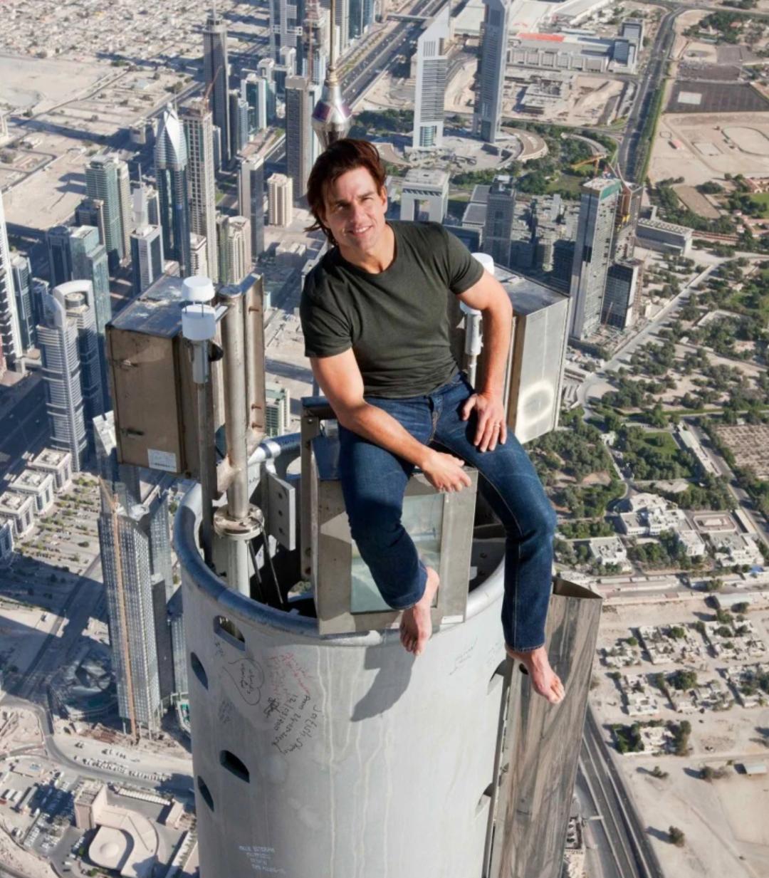 《碟中谍2》里,他拒绝替身,训练几个月后徒手爬上了828米高的迪拜塔顶,对着航拍机淡定微笑留念。