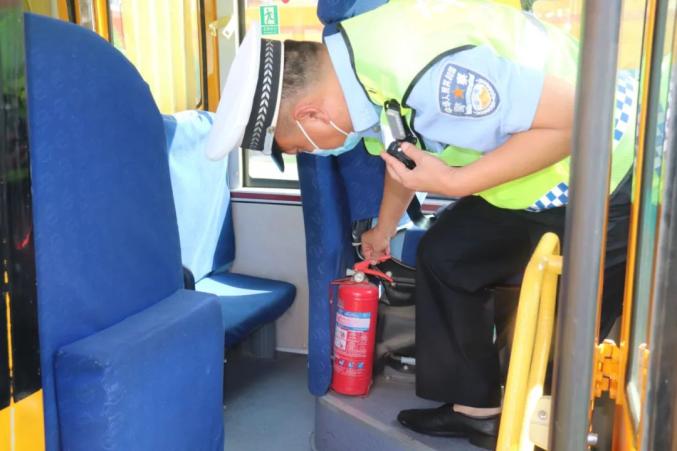 在朔州,民警来到校车检查站,对校车车况及逃生装置、灭火器、破窗锤、安全带等安全设施的性能进行重点检查,督促校车驾驶人定期做好校车的维护、保养和安全检查工作。