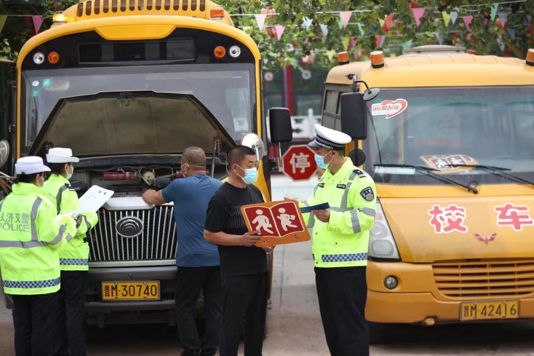 8月26日,永济公安交警对幼儿园校车进行“体检”,确定司机和安全员,并进行岗前业务知识和疫情防控的培训,护航校安,迎接秋季开学。