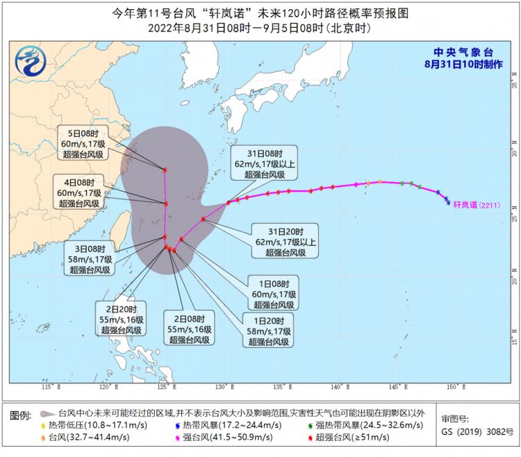 预计,“轩岚诺”将以每小时20-25公里的速度向西偏南转西南方向移动,9月1日至2日将在琉球群岛以东洋面停滞或回旋,强度变化不大或略有减弱;尔后转向北偏西方向移动,3日夜间移入东海东南部海面,强度变化不大或略有增强。受南下弱冷空气和“轩岚诺”外围环流的共同影响,9月1日凌晨开始我国东海海域的风力将逐渐加大到6-8级,阵风9-10级。