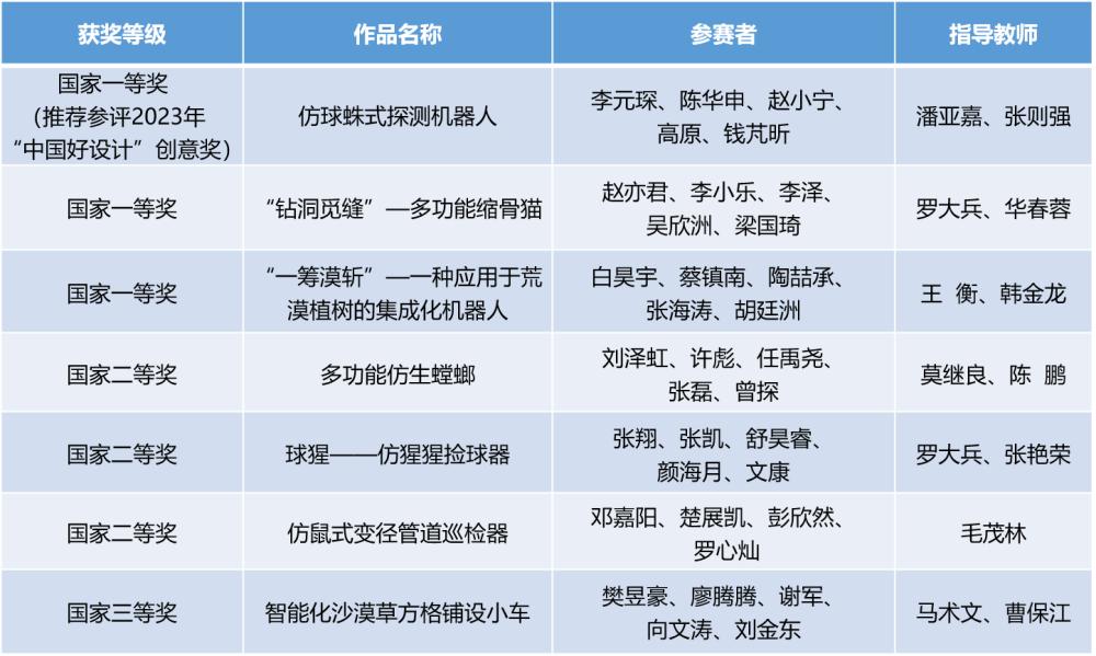 受新冠肺炎疫情影响,本次决赛第二阶段采用实物线上评审,通过PPT答辩、实物作品演示及评委问辩,评审委员会从作品选题的新颖性、创新性、实用意义,作品设计的合理性、图纸质量、作品的制作及功能实现等方面进行了综合评价,共评出一等奖162项(获奖率约3%),二等奖266项(获奖率约5%)和三等奖125项,推选“中国好设计”9项(约2‰)。大赛自2021年4月本届公布主题伊始,学校就成立了由教务处统筹、机械工程学院负责组织的备赛工作组。备赛期间学校组织竞赛讲座周、金牌导师赛题解读等环节,全体参赛学生克服疫情带来的困难,历时一年多制作完成作品,参加了校赛中期答辩、校赛决赛、省赛、国赛初评等选拔赛事。最后,西南交通大学作品《仿球蛛式探测机器人》以第一名成绩入围推荐进入2023年“中国好设计”创意奖评选(全国仅9项),该评选是由中国工程院发起,中国创新设计产业战略联盟主办,面向全国产业界的大型专业评选活动。
