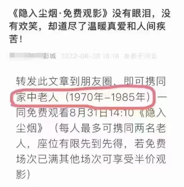 近日,河北清河县一家电影院发布的免费观影活动信息,在社交媒体上刷屏。该影院称:观影者可以带“家中老人(1970-1985)”免费观影,引发不少中年人主动转发和自我解嘲。对此电影院回应称,确实“就是一个调侃”,“初衷是希望小一辈带父母来看电影。”