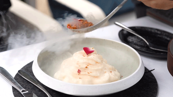 杏仁卡仕达搭配罗勒冰沙柠檬啫喱,上面挤百里香奶泡,在撒上蜂窝跳跳糖,仙气十足,新奇有趣。