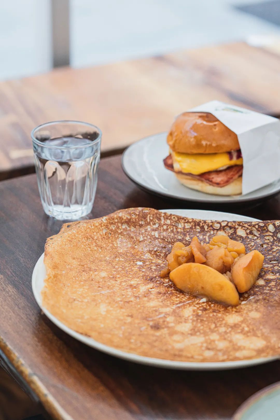 几乎每桌客人都点了可丽饼,隔壁桌强推蘑菇熏肉荞麦可丽饼,拍着胸脯说梦回巴黎。不过我们的餐桌缺点儿甜,选择了焦糖苹果口味。饼皮酥脆,香气十足,空口吃也很满足。