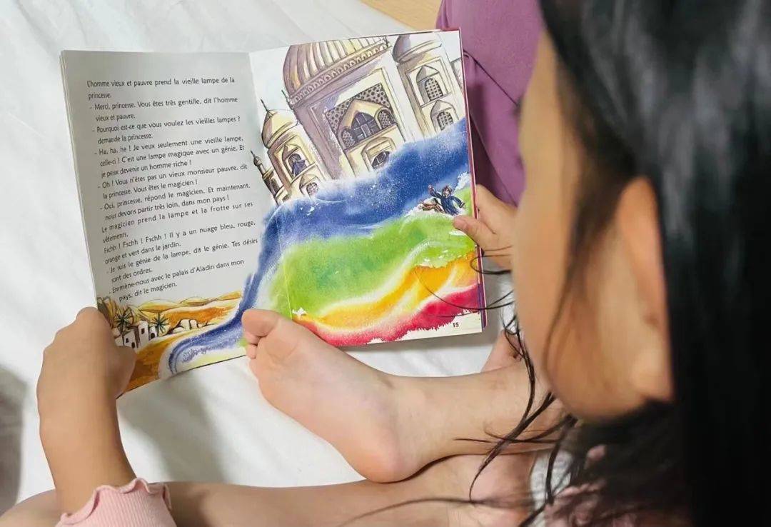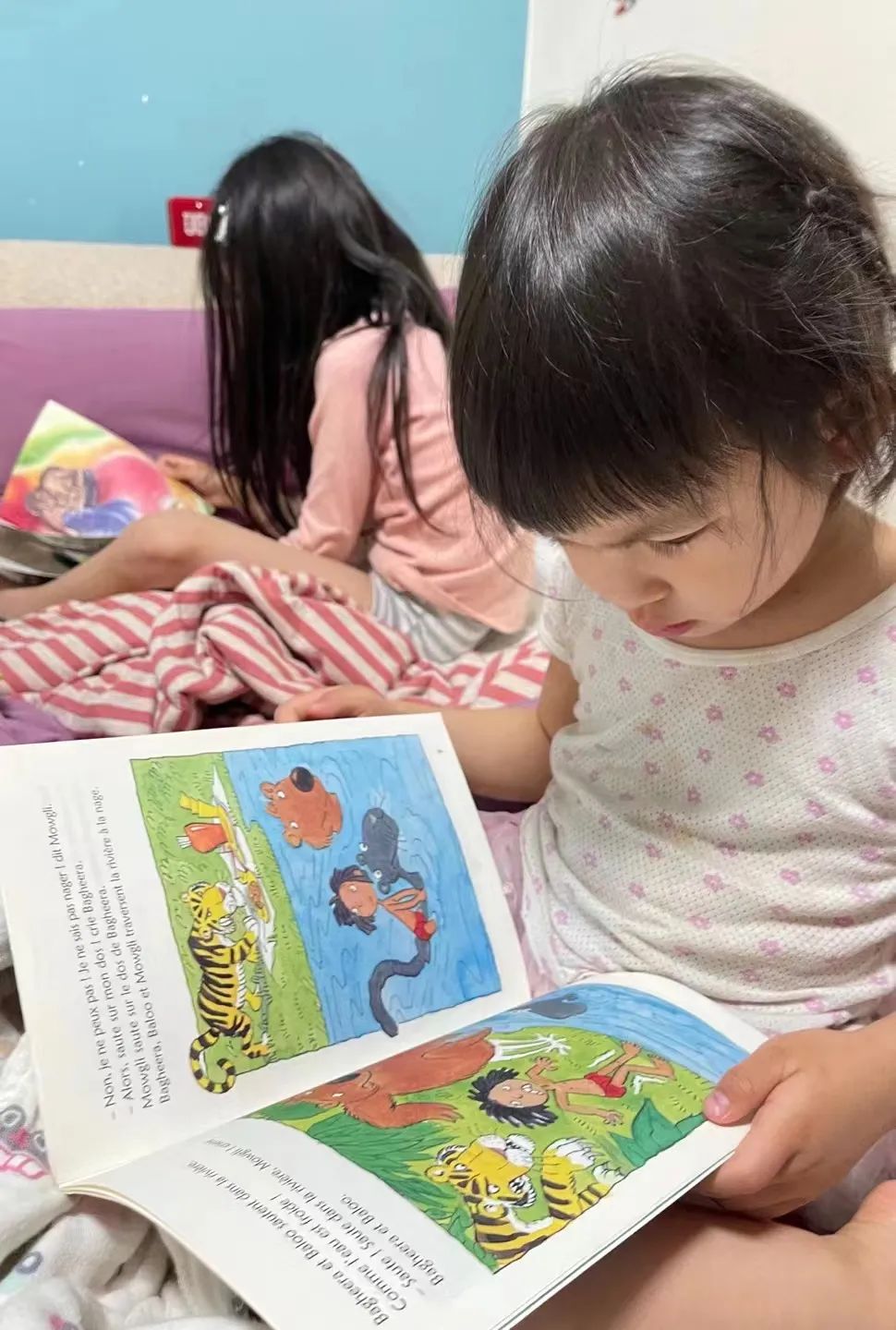 再说到法语,欧米的法语是零基础入门,她是先自学了半年多,才开始和孩子们一起来的。主要是从听儿歌开始的,一开始她们一起听,后来孩子们就自己听了,用点读笔,然后没几天他们就会唱了,欧米还只会哼调调。“可以说,外语学习,妈妈永远学不过娃,就是领路人而已。成人是用脑子学习,小朋友是用感官在学习,脑子的逻辑强,入门快,但是固有的思维也会极大地干扰学习。”
