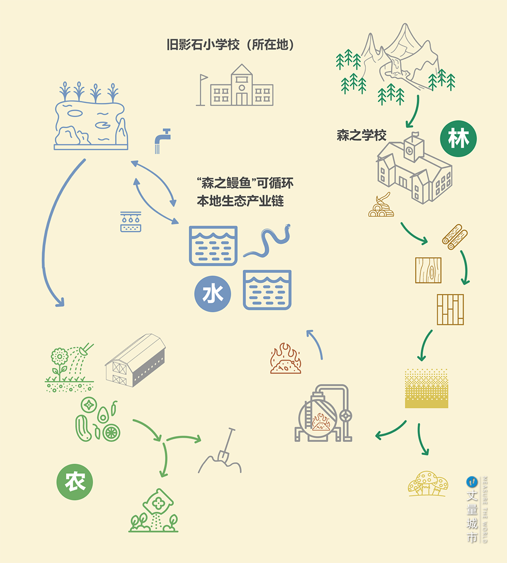 ▼ 西粟仓村「森之鳗鱼」可循环本地生态产业链。每一环节都利用了本地产业,每一环节产出都能成为其他产业的原材料,最终形成闭环,实现可持续可循环的目标