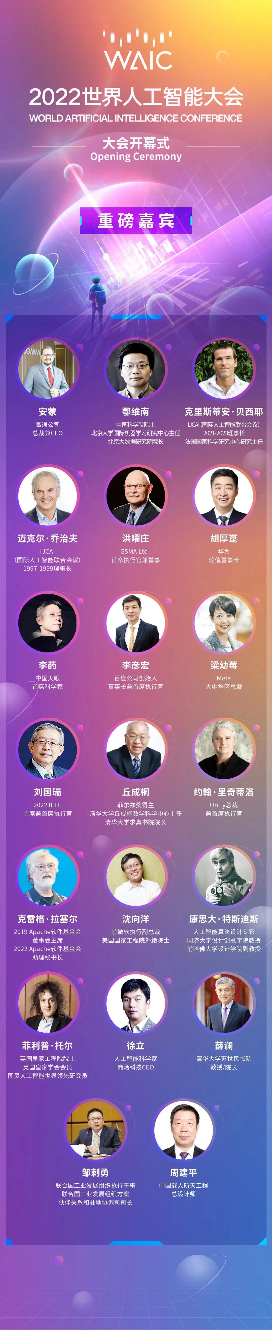 2022IEEE主席兼首席执行官刘国瑞、GSMALtd.首席执行官兼董事洪曜庄、IJCAI2021-2023 理事长Christian Bessiere、2019 Apache软件基金会董事会主席Craig L Russell等全球顶尖组织齐聚共贺,呈现大会“智联世界”宗旨。