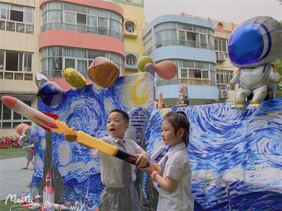 杭州市朝晖新村五区幼儿园的老师们穿着宇航员表演服饰,欢迎孩子们入园,孩子们带着和爸爸妈妈一起用废旧材料制作的各种各样的小火箭,进行了一次“穿越星空”的展示,让孩子们放飞梦想,扬帆起航。