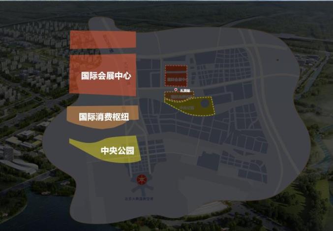 大兴机场临空区国际会展消费功能区毗邻北京大兴国际机场这一新国门,将打造战略性、标杆性和开放性的综合片区开发。整个功能区距大兴国际机场东北方向4公里,西侧临南中轴线,占地面积约7.8平方公里,包括会展中心,Tod轨道站点,消费枢纽和中央公园等板块。