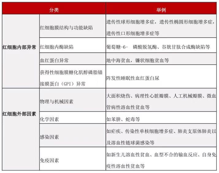 分为红细胞内部异常和外部因素两大类,见表1。