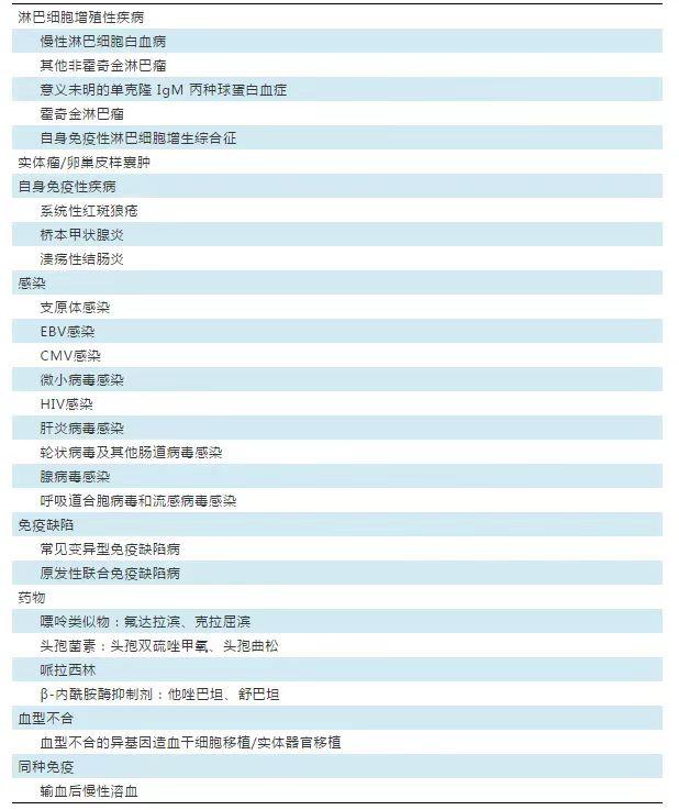 (2)继发性AIHA:有可引起溶血的基础疾病,常见继发性溶血性病因见下表2。