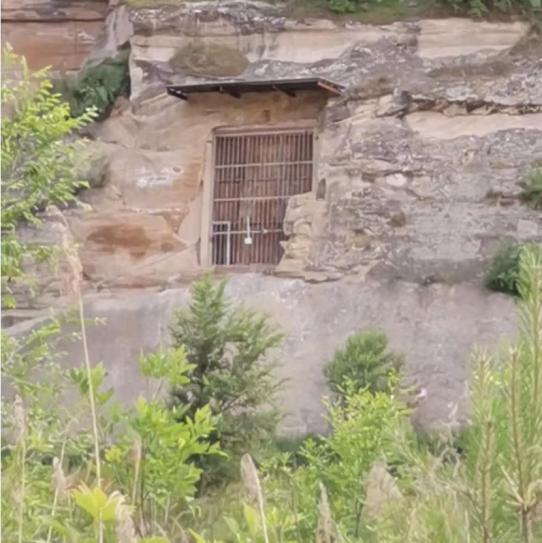楼底村一号窟 外景此窟为平面长方形平顶中心柱窟。窟门高447厘米,窟内高493厘米,内宽477、外宽433厘米,原窟进深660厘米。中心柱柱形分两层,下为方形,高282厘米,上为八棱形,高165厘米。上层八面开盝形顶小龛,下层平面为方形,前宽225、后宽243厘米,北侧长262、南侧长270厘米。四面开圆拱顶大龛。