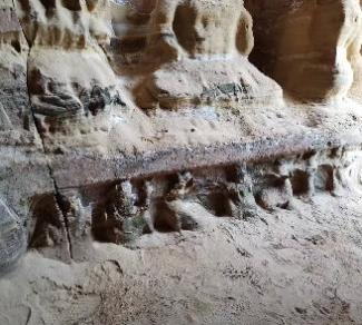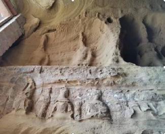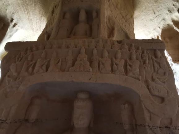 楼底村一号窟 中心塔柱窟内正壁(西壁):雕一立佛,二侍立菩萨。佛高482厘米,右侧菩萨高467厘米,左侧菩萨高468厘米,风化严重,衣纹、手印均不可识。