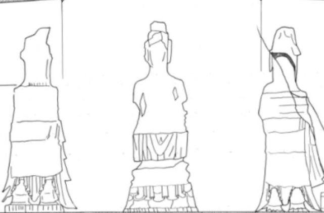 楼底村一号窟南壁 线描北壁,上层三龛内均雕一佛二菩萨,佛结跏趺坐,菩萨侍立于两侧。龛间两个隔柱上部各开一圆拱形浅龛,龛内雕坐佛,但风化严重,衣纹、手印均不可识。