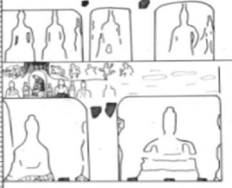 楼底村一号窟北壁 线描窟内南北两壁布局基本相似,均为上层三龛,下层两龛,上下层之间雕有故事画面。造像虽风化严重,但从现存的造像布局上依然可以看到此窟有着较为丰富、完整的设计构思。