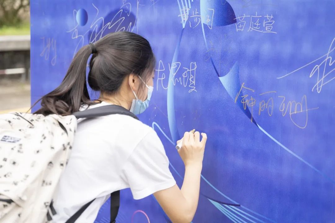 和新同学在迎新墙前合个影