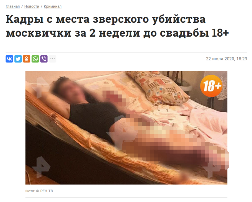 REN TV发布这张图片的时间在2020年7月22日,因此不可能是沃夫克“中刀”后的现场照片。相关报道称,一个叫Marina P. 的25岁莫斯科女性在其婚礼前两周被杀害,其未婚夫的母亲在2020年7月21日于科尔帕奇尼巷的一所房子里发现了她的尸体,但该未婚夫的下落不明。