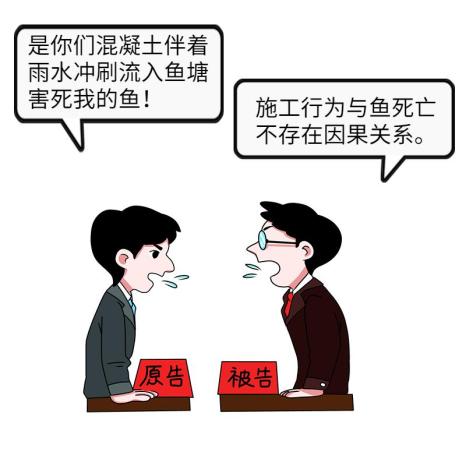 原告称,其承包的鱼塘与被告公司承建的高速公路入口工程相邻,被告每天进行混凝土搅拌施工,但没有合理建设排水系统,后因连降大雨,混凝土伴着雨水冲刷流入鱼塘,造成鱼类大量死亡。经检测鉴定,造成鱼死亡的原因系养殖水体呈强碱性,腐蚀鱼鳃组织,造成鱼类呼吸障碍而窒息死亡。被告辩称,其施工行为与原告鱼塘里的鱼死亡不存在因果关系,鱼群死亡系不可抗力,且死亡数量也系原告单方统计,不能反映实际死亡情况。同时,原告没有尽到安全养护鱼塘的义务,造成了损失扩大。