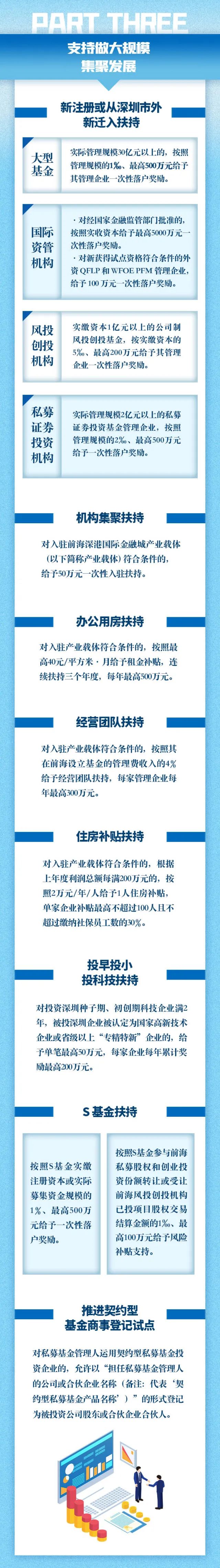 支持香港等境内外资产管理机构,以及银行理财、保险资管等机构投资者在前海设立S基金,对管理企业按S基金实缴注册资本或实际募集资金规模的1%、最高500万元给予一次性落户奖励;支持S基金参与前海私募股权和创业投资份额转让或受让前海风投创投机构已投项目股权,按照其交易结算金额的1‰、最高100万元给予风险补贴支持。