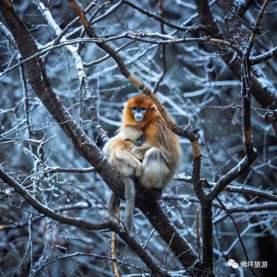 一年后,我来到陕西佛坪的熊猫谷景区。雪后游客稀少,沿着步道往里走,可独享大自然的静谧。到了野人谷,我发现左侧山坡上,几十只川金丝猴正在枯树林中嬉戏。作为疣猴亚科的一员,川金丝猴栖息在环境寒冷且潮湿的陕西、四川、甘肃和湖北等地的高山森林中,常数百只群居。这种庞大的群体在一个地区活动或迁移时所表现出的严密社会组织和结构,在其他灵长类动物中少见。为了更好地研究野外川金丝猴的习性,科学家们需要将猴群习惯化。所谓习惯化,就是通过长期跟踪并辅助野外投食,让野外猴群习惯人类的存在,有点类似于将野外的猴子“招安”。我所见到的这群猴子,正是被习惯化的野外猴群。