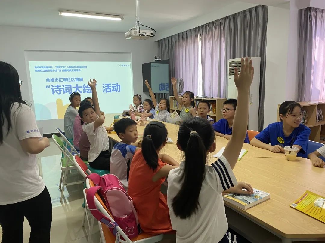 7月22日,余姚市汇翠社区的小小体验官们以“走进诗词、文化传承”为主题,举行了首届社区“诗词大绘”活动。通过诗词飞花令、你画我猜、诗词车轮战三个回合的合作与比拼,孩子们深入感受中华上下五千年历史文化的独特魅力,不断领悟国学经典所蕴含的人生智慧。汇翠社区自成立“群英汇翠”儿童议事会以来,致力于社区少年儿童的全面发展,积极组织各类儿童友好活动,鼓励儿童参与社区治理。