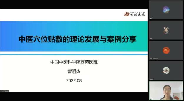 中国中医科学院西苑医院訾明杰主任从中医穴位贴敷的源流、中医穴位贴敷的临床特点、中医穴位贴敷的标准化等方面介绍了中医穴位贴敷理论和实践的发展,分享了风热犯肺咳嗽、食积咳嗽、慢性结肠炎等穴位贴敷的有效病例。