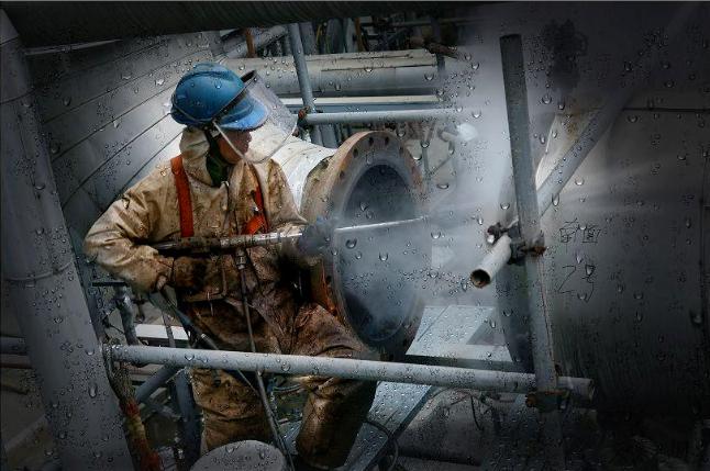 抢修纪事 @ 2007工业摄影的重要内容之一,就是表现工程技术人员和广大劳动者的工作场景、生活场景。《抢修纪事》创作于2007年,看到作品画面,使我们仿佛置身于管线林立,机泵纵横的炼油装置,从而感受到一种强烈的真实感,而镜头中凝聚了艰辛之美,那银色的罐体、白色的雾,与穿着橙色劳动服装的工人,相互呼应,给人以身临其境的感觉。同时又流露出,对为石油石化事业,付出辛勤劳动的人们的赞扬。4个银色的圆形立体油罐,加强了画面的形式感,也使作品具有了工业摄影的厚重感。