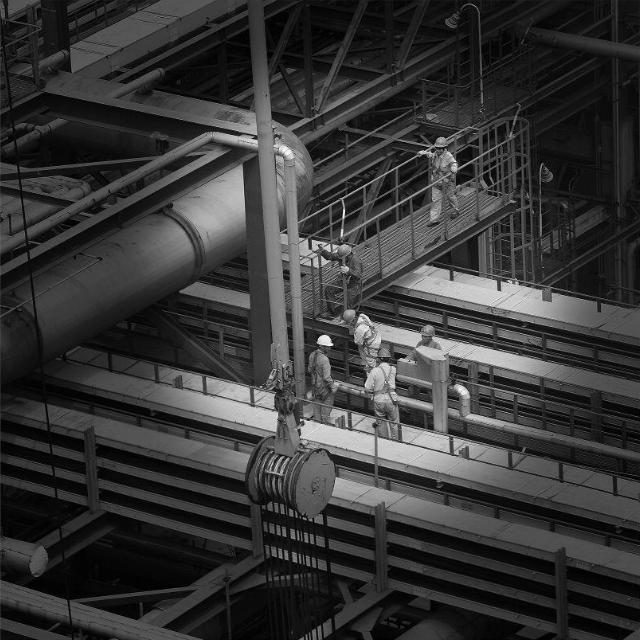 《工业现场》系列作品是我拍摄于2015年石油石化企业的检修现场。作品通过相机镜头各种视角的运用,零乱的检修现场,许多美丽被提炼了出来,即使是最寻常的地方,也拍出了强烈的韵律感:高耸的炼塔,环绕的管线,曲折的通道,忙碌的检修工人,都呈现出一种大气之美和力量的之美。作品通过庞大的现代化设备与渺小的检修工人的对比,反衬出劳动光荣,工人伟大的立意,作品以黑白影像呈现,体现了自己的思想内涵和创作理念,使厚重的工业摄影更具有象征性,更显单纯化,更富有想象空间。