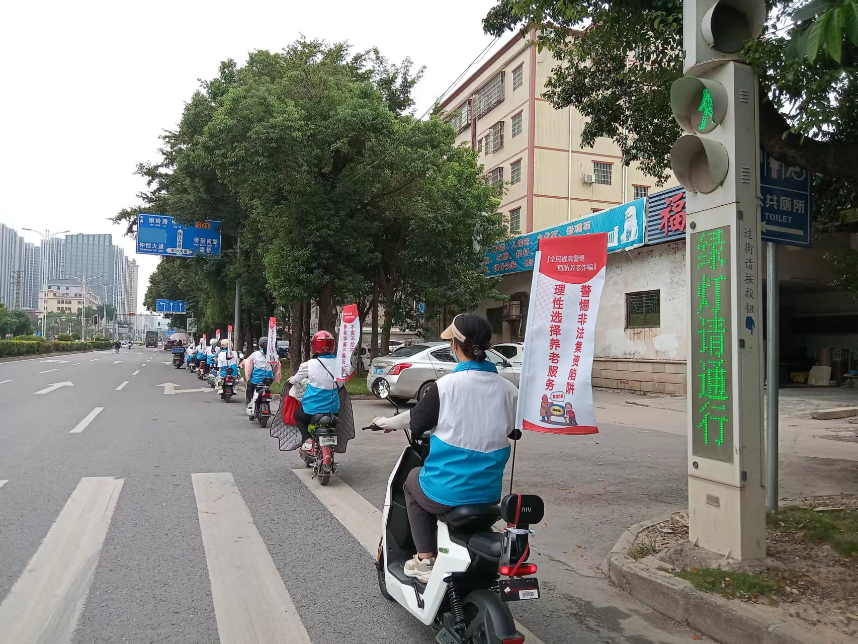 社工们身穿统一服装,从御湖社区长者服务站出发,按预订路线开展骑行宣传。一路上,电动车后面印有“养老诈骗不难防,不贪不给不上当”、“理性选择养老服务,警惕非法集资陷阱”反诈标语的旗帜随风飘扬,车头小喇叭播放的反诈提醒声声入耳,骑行队伍的“立体式”“沉浸式”宣传让长者、居民对预防长者防诈有了更深刻的认识和了解。据了解,本次骑行共10公里,途径陈江社区医院、鑫月城、体育馆、壹城中心、荷兰小城、五一花园,最终绕回御湖社区长者服务站,沿途引起众多群众观望,身穿蓝白马甲的社工人员与志愿者在路上形成了一道亮丽的风景线。