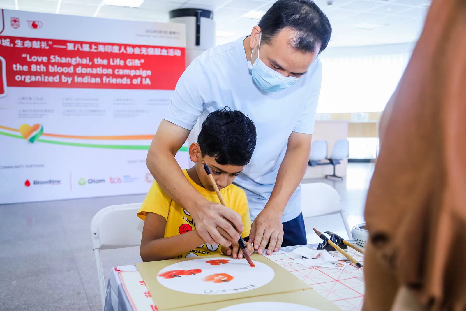 除了参加献血的印度友人,当日现场还有不少像Tanvi Bhanushali一样的印度小志愿者,他们大多十四五岁,身穿志愿者服装,用流利的普通话和英文,为献血者指引路线,维持活动秩序。这些印度孩子从小都随父母生活在上海,其中不少一直跟着父母参加献血活动。他们认为,献血活动不仅能让孩子接触中国文化,还能教育孩子学会爱与分享,是生动的人生教育课。