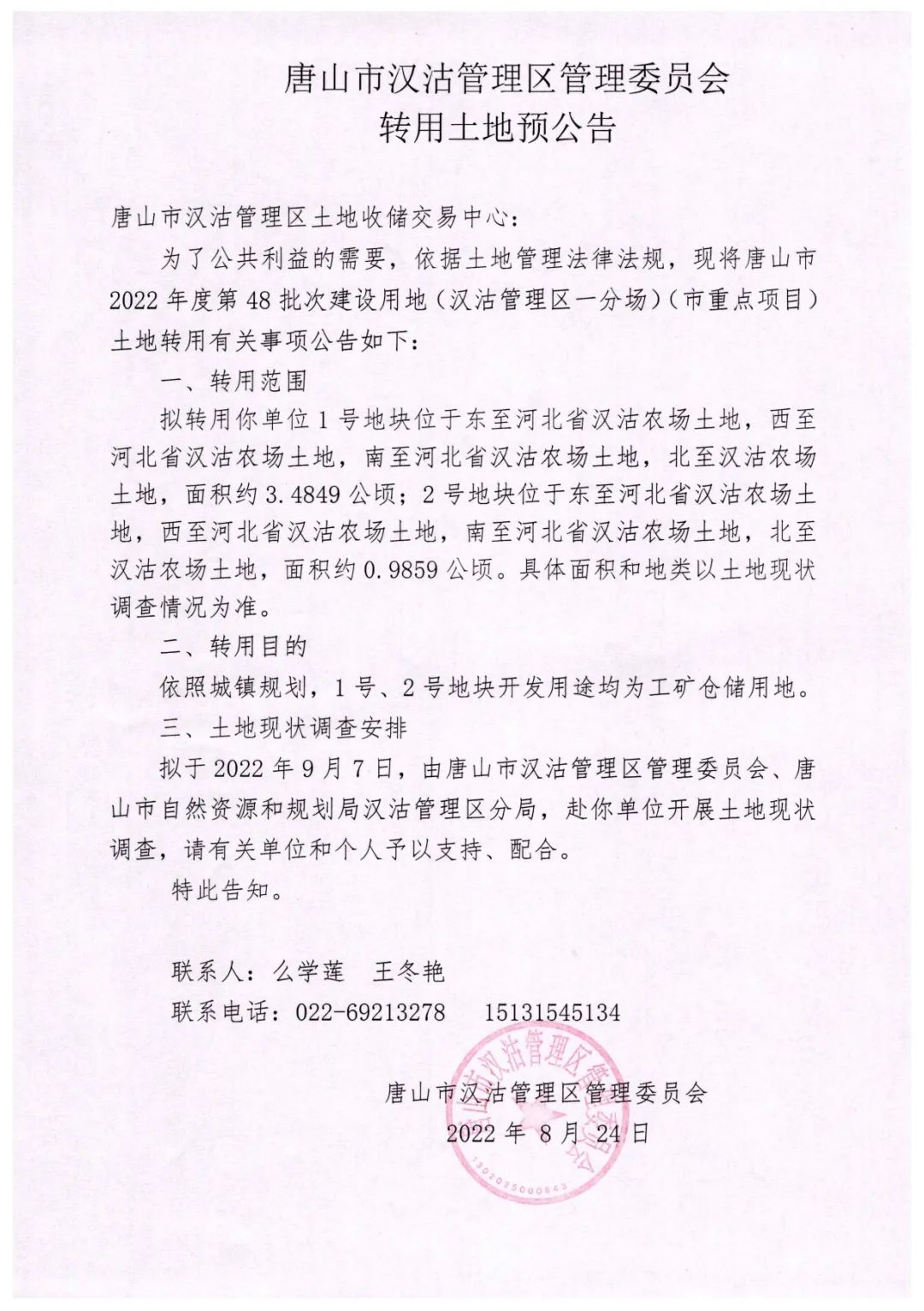 转用范围、面积:1号地块位于东至河北省汉沽农场土地,西至河北省汉沽农场土地,南至河北省汉沽农场土地,北至汉沽农场土地,面积约3.4849公顷;2号地块位于东至河北省汉沽农场土地,西至河北省汉沽农场土地,南至河北省汉沽农场土地,北至汉沽农场土地,面积约0.9859公顷。