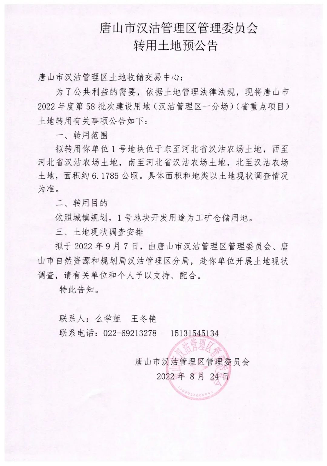 58批次转用范围、面积:1号地块位于东至河北省汉沽农场土地,西至河北省汉沽农场土地,南至河北省汉沽农场土地,北至汉沽农场土地,面积约6.1785公顷。