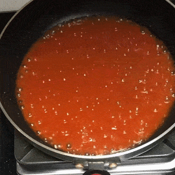 4. 锅内热油,倒入番茄酱、白糖、米醋、水,煮至沸腾冒泡