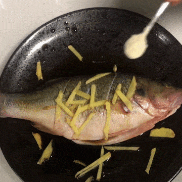 2. 加料酒,蒸鱼豉油、姜丝、鸡精、盐、胡椒粉腌制入味