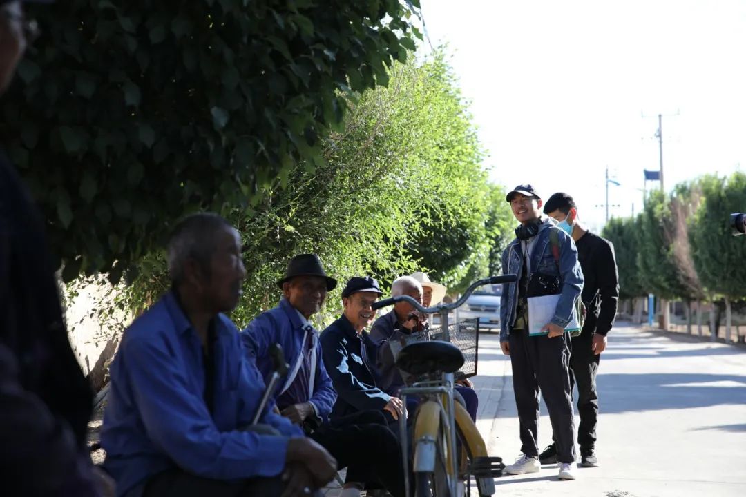 ▲李睿珺和乡亲兼群演们说笑,《隐入尘烟》拍摄现场