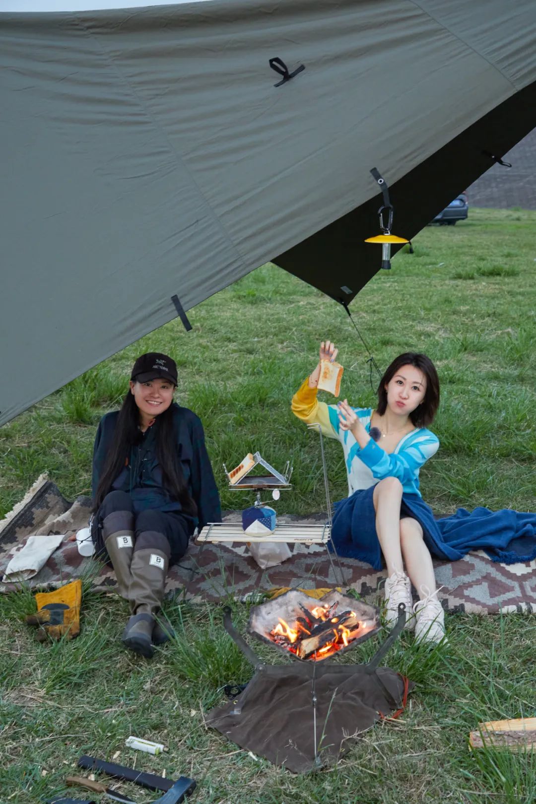 可折叠的户外桌当做茶几,四张露营椅当做沙发。露营椅重心比较低,坐进去就有种“瘫”倒的感觉,