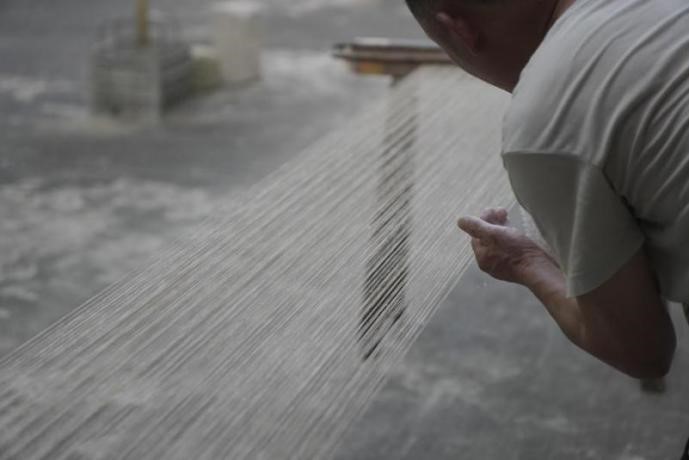 只见浏阳夏布第五代传承人谭智祥一手捧着一抔米浆,一手拿着专用刷把,用刷尖将掌中的浆料一点点溅到原麻上,从原麻的一头开始,沿着纤维延伸的方向一边移动一边溅刷,来回数次,耐心细致。