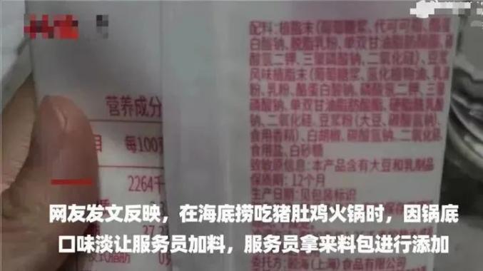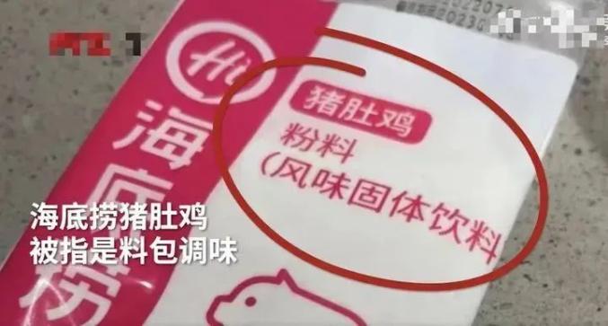 近日,有网友发文称,自己在海底捞吃猪肚鸡火锅时,因锅底口味淡让服务员加料,服务员拿来粉料包进行添加,料包上写着“风味固体饮料”。