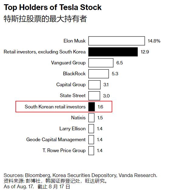 别以为这只是口嗨,新冠疫情期间,韩国散户买入了 150 亿美元特斯拉股票,成为了特斯拉第七大股东,排在他们前面的是华尔街。持股比例达到 1.6% ▼