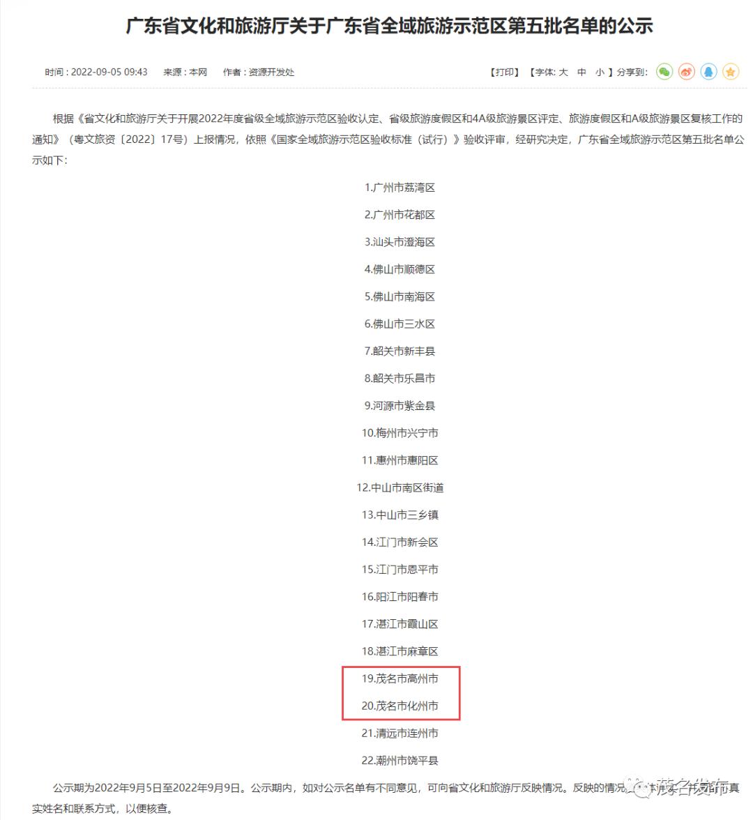 9月5日,广东省文化和旅游厅发布《关于广东省全域旅游示范区第五批名单的公示》。根据《省文化和旅游厅关于开展2022年度省级全域旅游示范区验收认定、省级旅游度假区和4A级旅游景区评定、旅游度假区和A级旅游景区复核工作的通知》(粤文旅资〔2022〕17号)上报情况,依照《国家全域旅游示范区验收标准(试行)》验收评审,经研究决定,广州市荔湾区等22个县市区进入广东省全域旅游示范区第五批名单。其中,茂名高州市、化州市上榜。