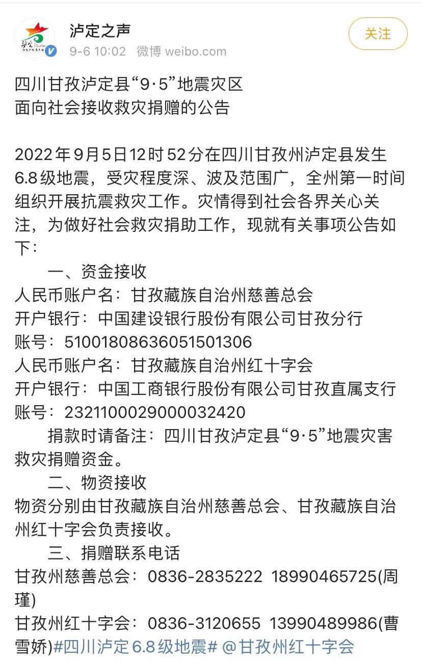 9月5日,甘孜泸定县发布面向社会接收救灾捐赠的公告: