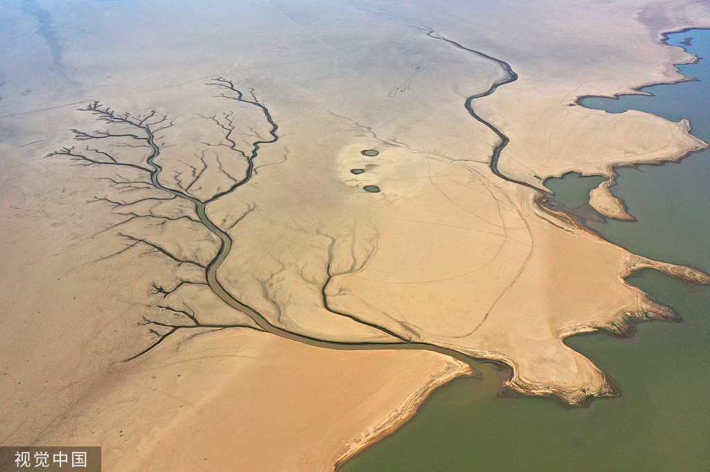 2022年9月6日,江西九江,都昌县鄱阳湖水域,大面积滩涂露出,干涸的湖床形成一个巨大的“树形图”。视觉中国 图