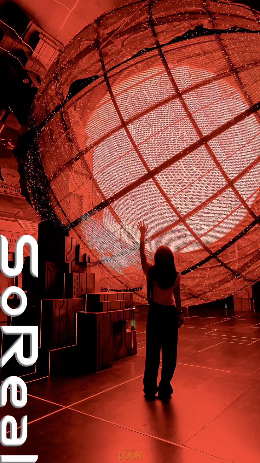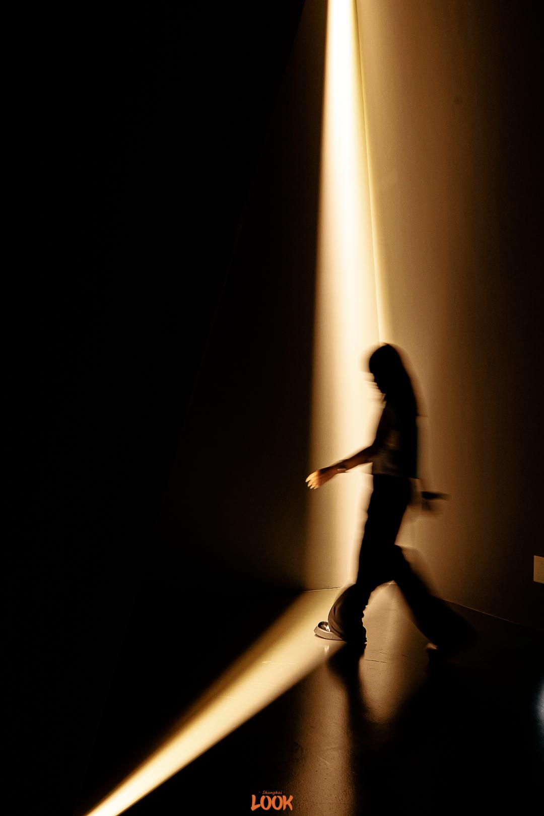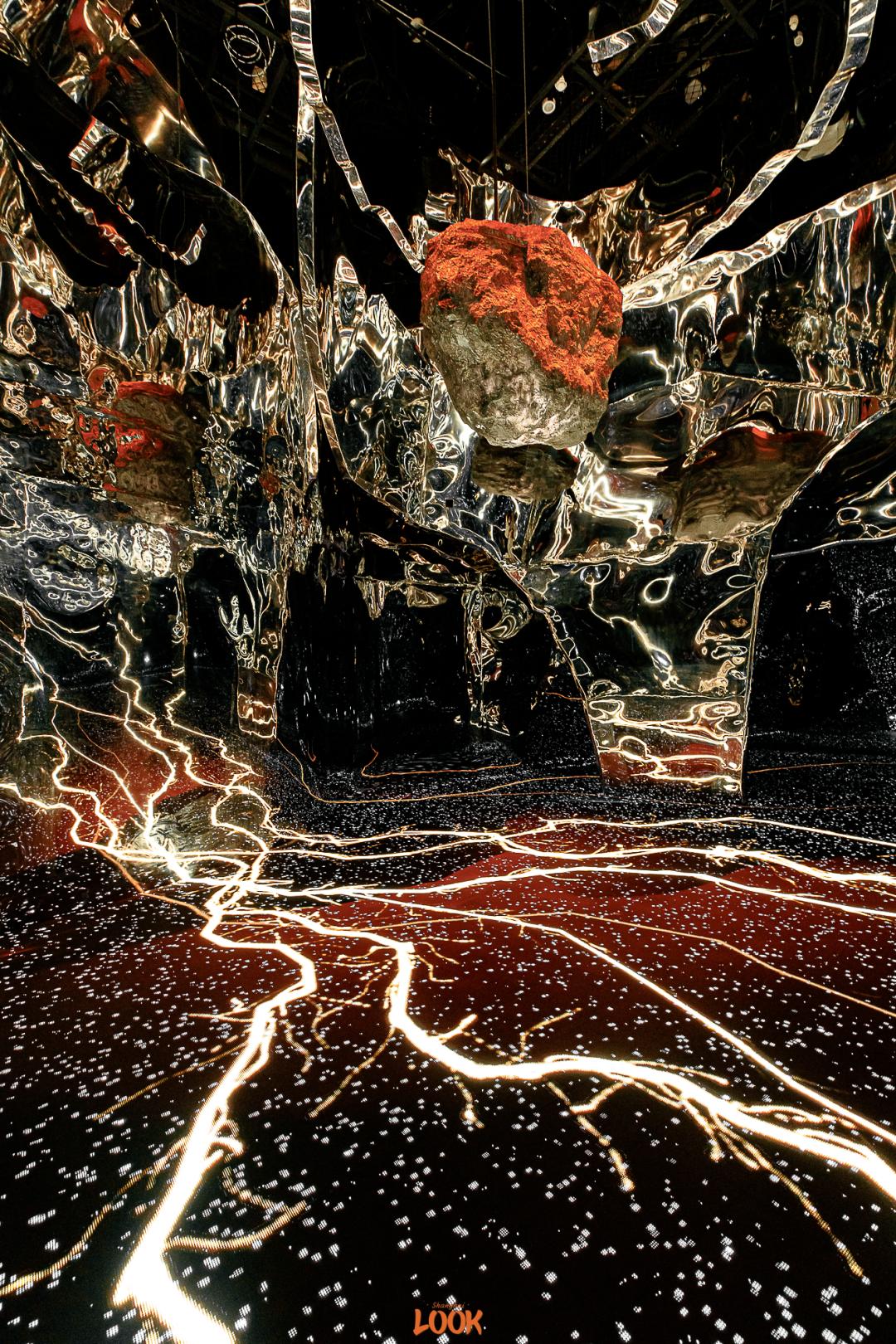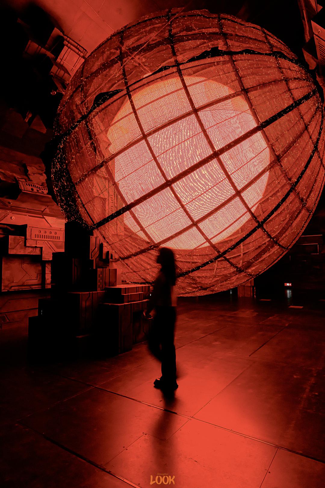 当球体逐渐冷静下来,漆黑空间里只剩下火红的灯光。置身其中并拍下剪影,超酷的。