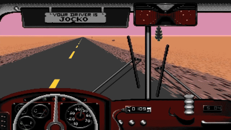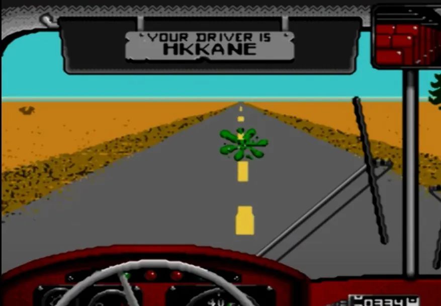 这是个充分体现开发者恶意的游戏。游戏场景中没有其他车辆,也没有旖旎风光,只有道路两旁的沙子、杂草、偶尔出现的路标,以及出现在大概第五小时、“啪”地在挡风玻璃上撞成烂泥,留下一滩绿色汁液的不知名虫子。这滩汁液将会作为你唯一的同伴,伴随你跑完全程——前提是你能顺利通关。