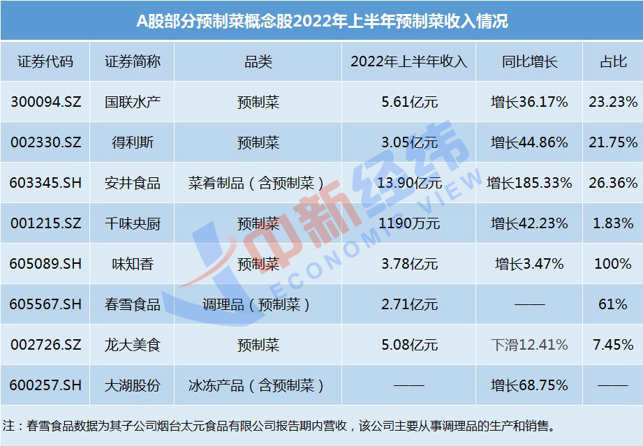 据Wind数据,目前,沪深两市共有30只预制菜概念股,中新经纬梳理发现,在2022年半年报中,味知香、国联水产、安井食品、千味央厨、得利斯、龙大美食、春雪食品、大湖股份等企业披露了报告期内预制菜及相关产品的收入情况。